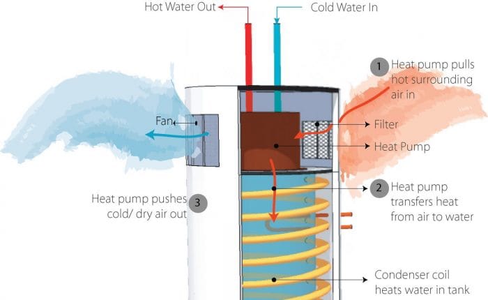 Air-to-water two-way ACs transfer heat from the ambient air into refrigerant on one side and into water or another fluid on the other side. A common example is heat pump water heaters, which move heat into water for household use. These systems can be extended with secondary loops using fluids like water or glycol for space heating.