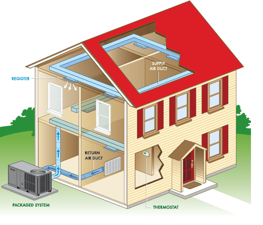 Unitary two-way ACs (often called packaged systems) contain all the components, including the heat exchangers, within a single box. A packaged HVAC unit is typically a large box that sits outside the home and connects directly into the ductwork. All the refrigerant connections are made inside the unit at the factory, and a large blower pushes air through the ducts into the home. Window air conditioners are another example of unitary systems, where all components are housed together.